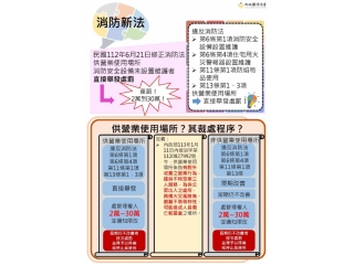 消防法修正案業經總統於112年6月21日公布生效,針對供營業使用場所違反消防安全設備設置及維護、防焰物品使用、防火管理業務等規定,經檢查不合格,由原規定應先通知限期改善修正為逕予舉發違規並裁罰,罰鍰金額提高為2萬元至30萬元!爰請各類場所管理權人平時應主動善盡維護消防安全設備、及依規定使用防焰物品(如窗簾、地毯、布幕)及依規定辦理防火管理業務(如遴用防火管理人、訂定消防防護計畫),避免違規而遭重罰。
